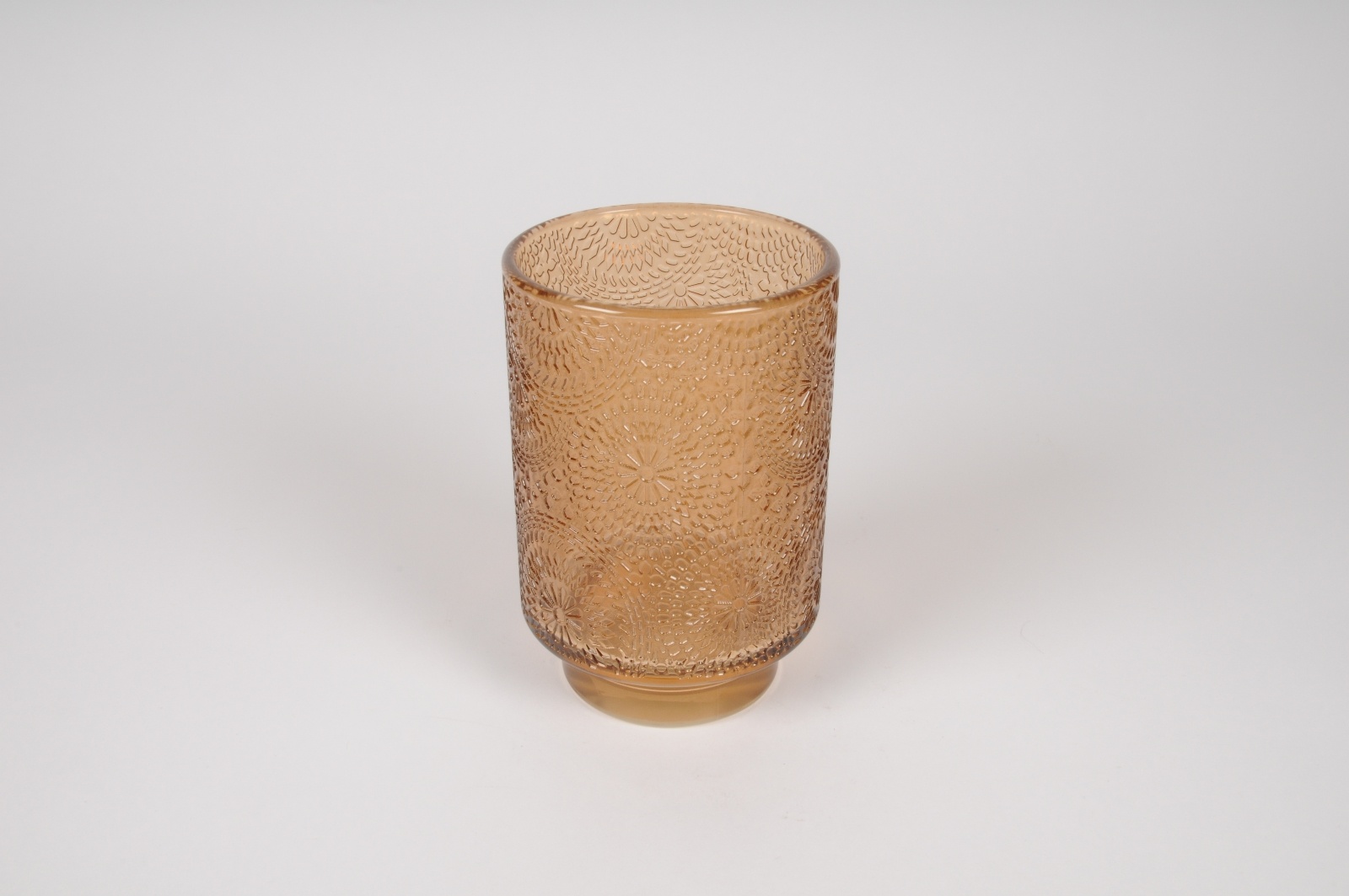 Amber glass candle jar on stand with flower pattern diameter 10cm height 15cmCandle jar height 12cmBase diameter 7cm height 3cm