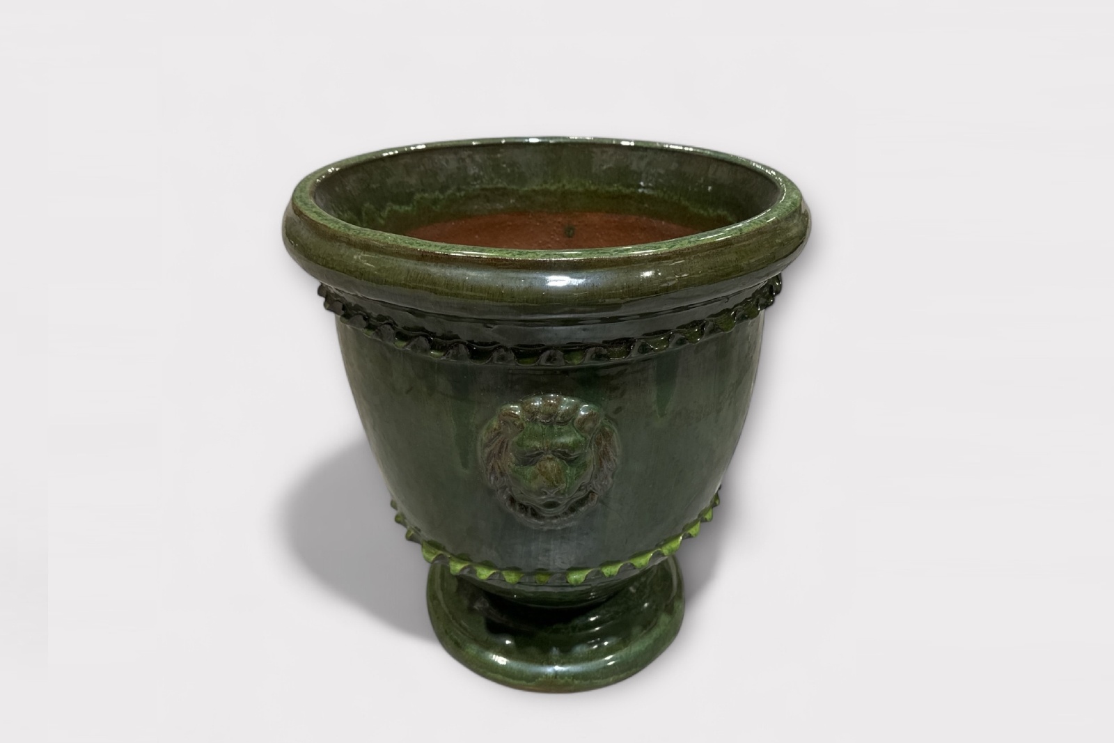 Anduze Ceramic Lion Head Pot Olive Green Glossy D40cm H43cm