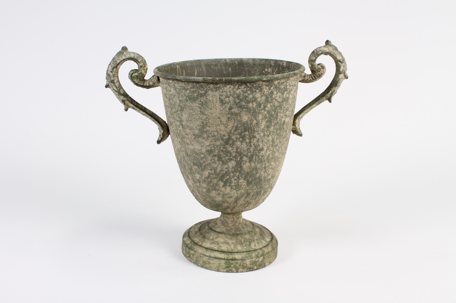 Antique green metal Medici vase with handles diameter 16.5cm height 24.5cmTotal diameter with handles 27cmBase diameter 11.5cm Watertightness not guaranteed