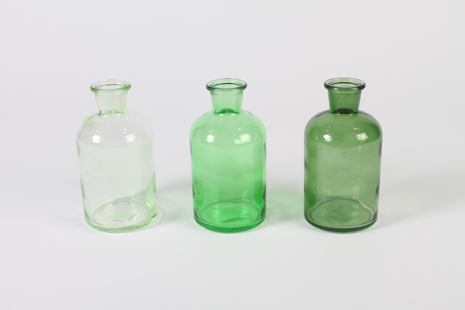 Assorted glass bottle vase with shades of dark, light and transparent green diameter 6.5cm height 12.5cmOpening diameter 2cm