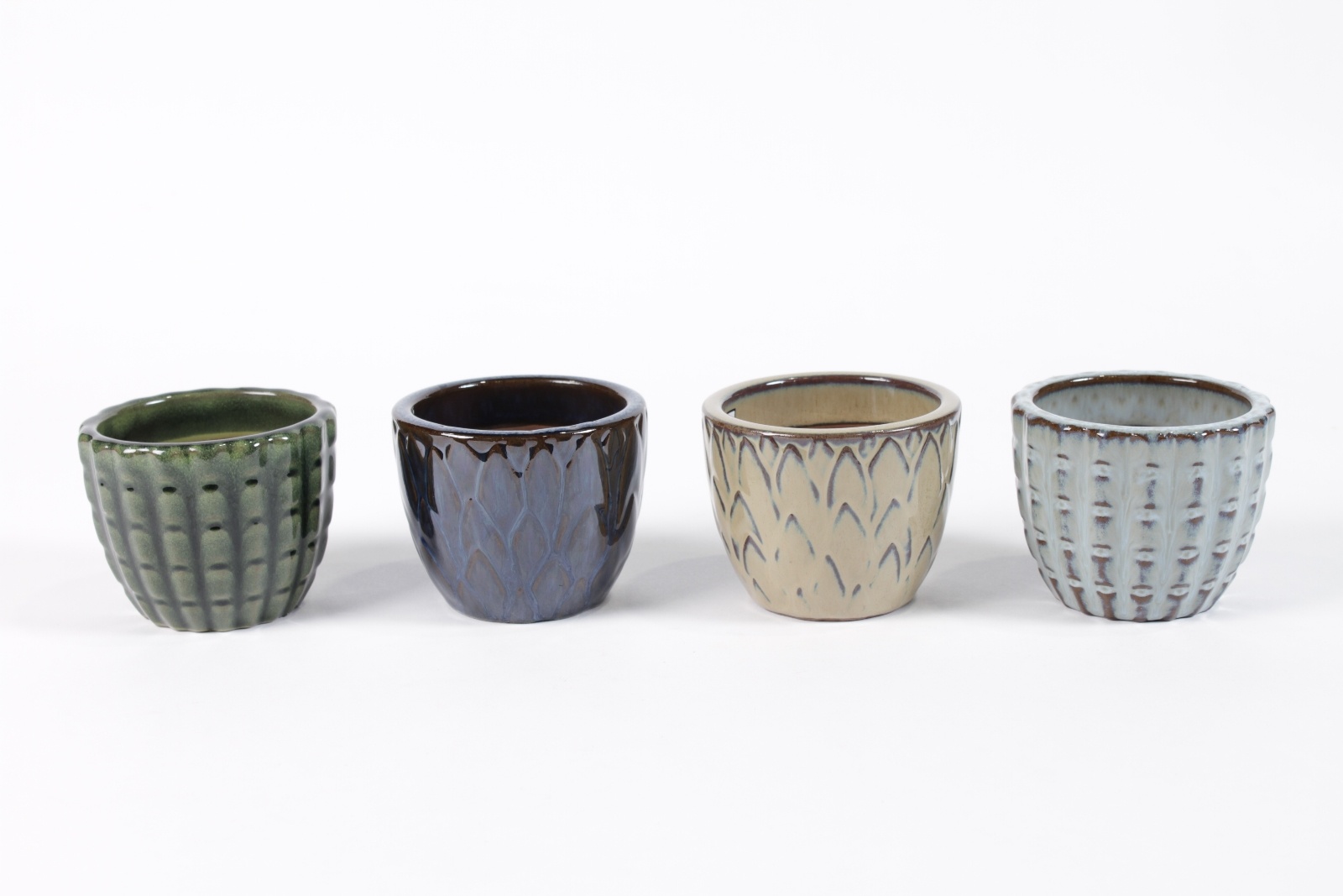 Assorted green, dark blue, sky blue or beige ceramic planter diameter 9.5cm height 7.5cmInside diameter 7.5cmBase diameter 6cm