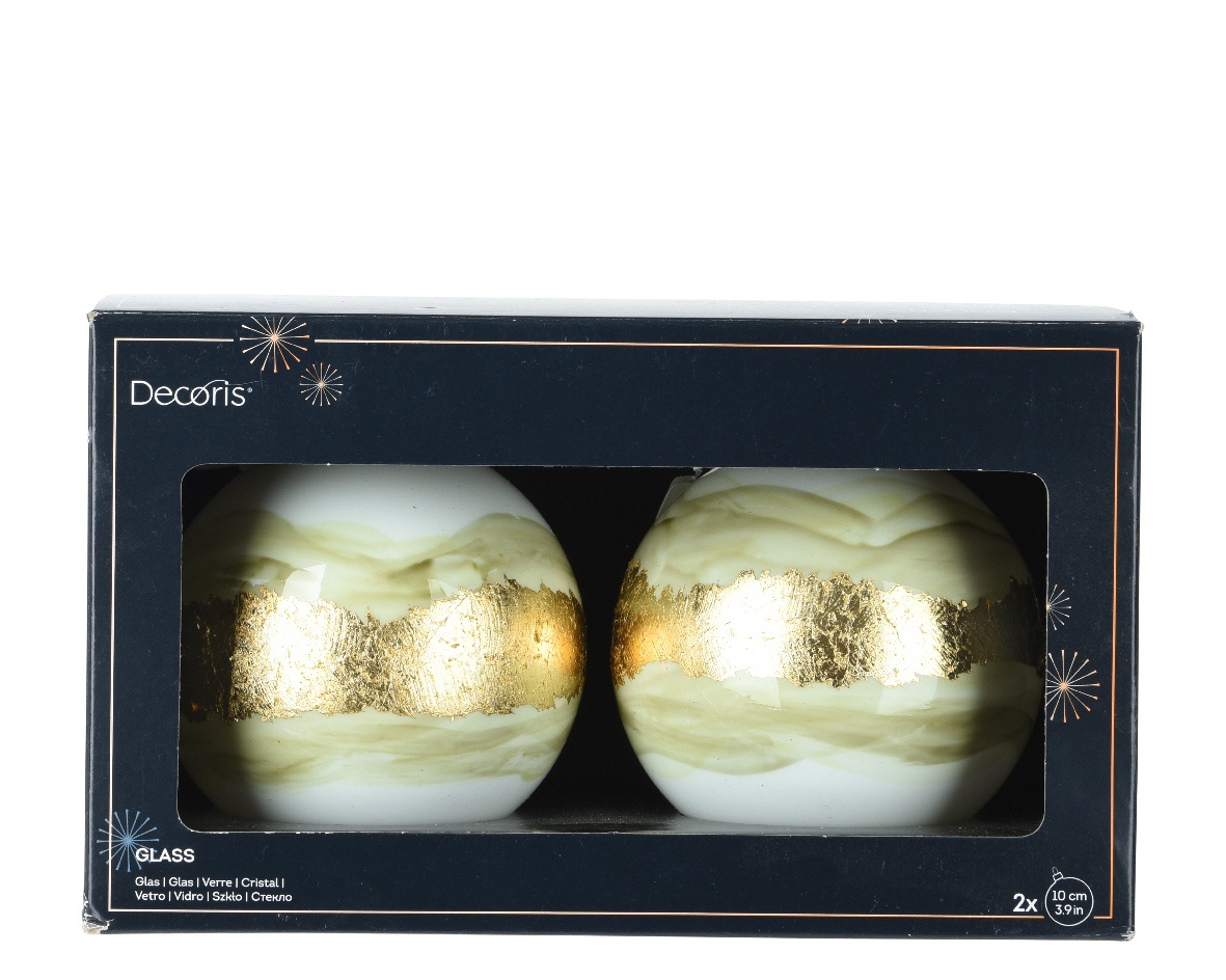 Boite de 2 boules en verre blanc avec ligne verte et ligne de feuille d'or diamètre 10cm