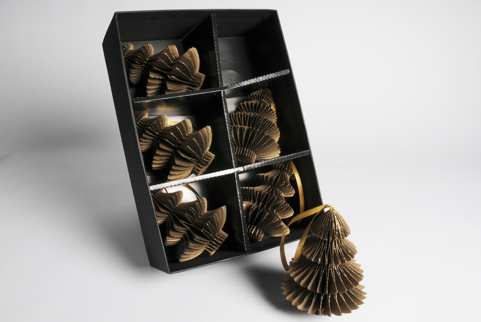 Box of 6 taupe and gold paper christmas tree to hang up height 14cm