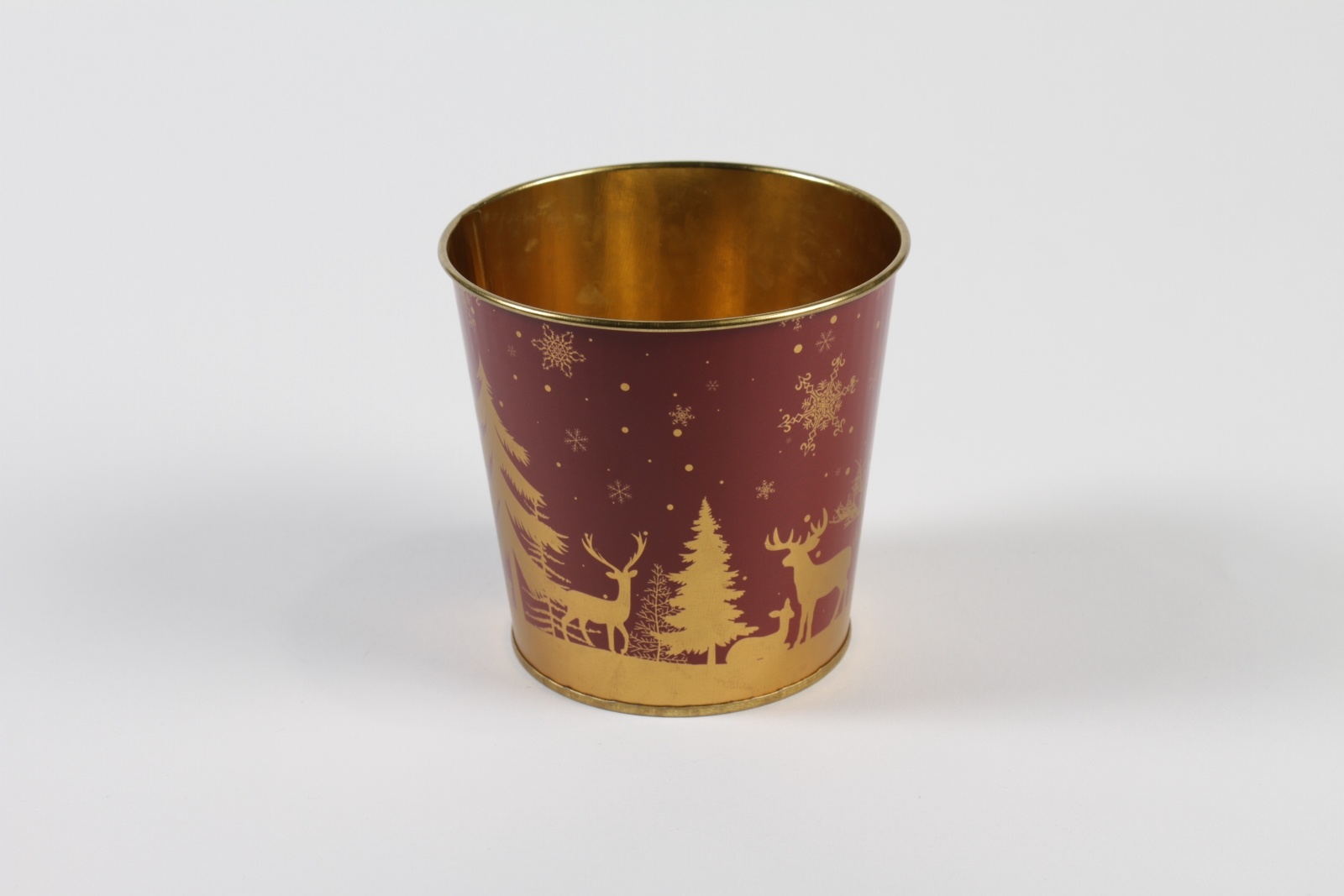 Ref. : MH-000033 Burgundy zinc plant pot with gold Christmas pattern, diameter 11.4cm, height 10.6cm