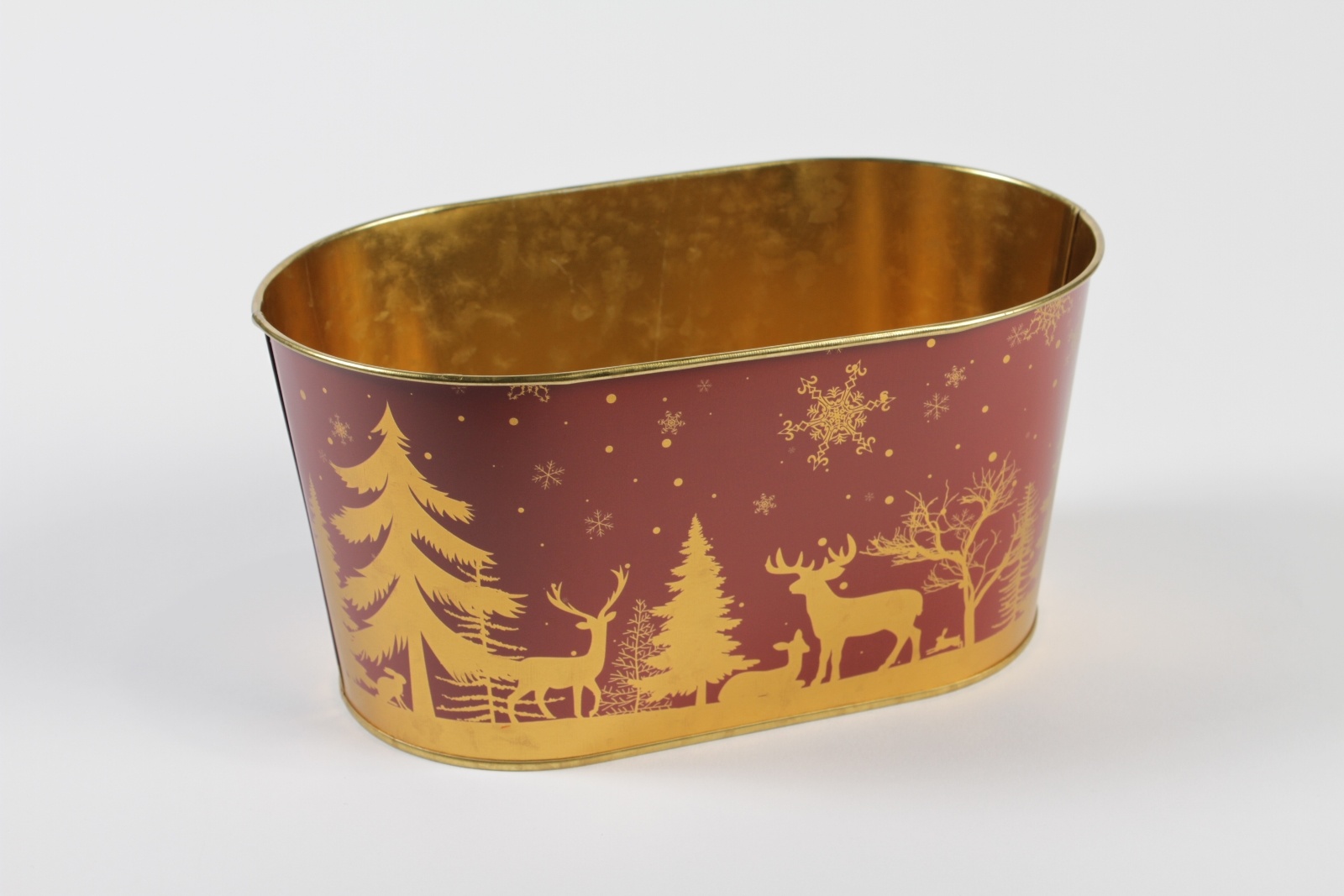 Ref. : MH-000045 Red zinc planter with gold Christmas pattern, length 22.5cm, width 13.7cm, height 11.3cm
