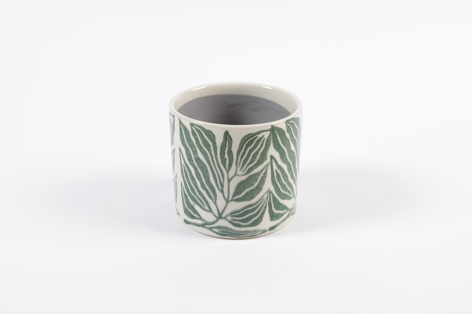 Réf. : YU-000013 Cache-pot en céramique feuille verte sur fond blanc diamètre 12cm H10.5cm