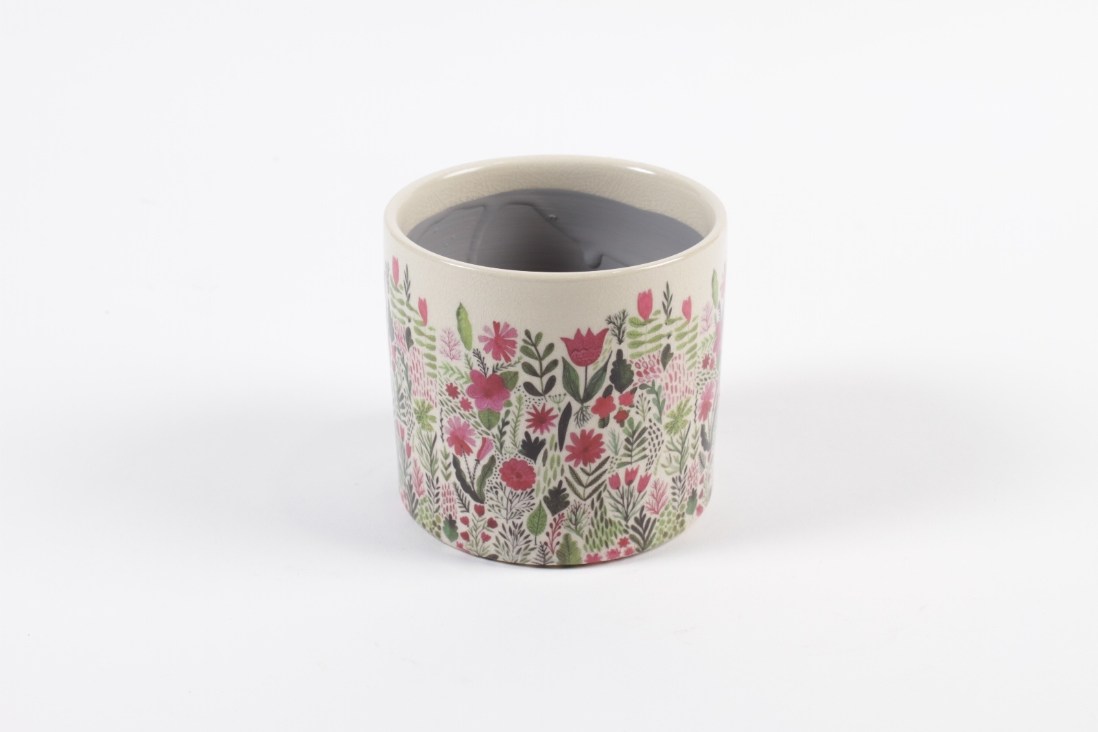 Réf. : YU-000015 Cache-pot en céramique fleurs de prairie sur fond blanc diamètre 14cm H12.5cm