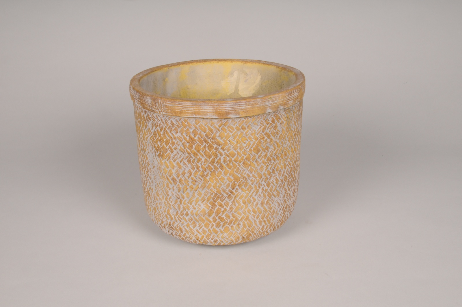 Cache-pot en béton ciment jaune foncé ocre imitation bambou patiné diamètre 21.5cm hauteur 20cm