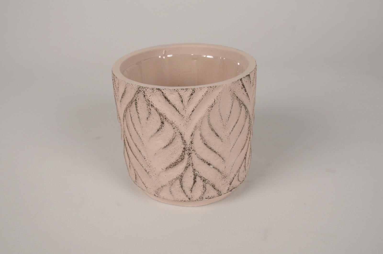 Cache-pot en béton rose avec motif feuille en relief diamètre 13.5cm hauteur 12.5cm