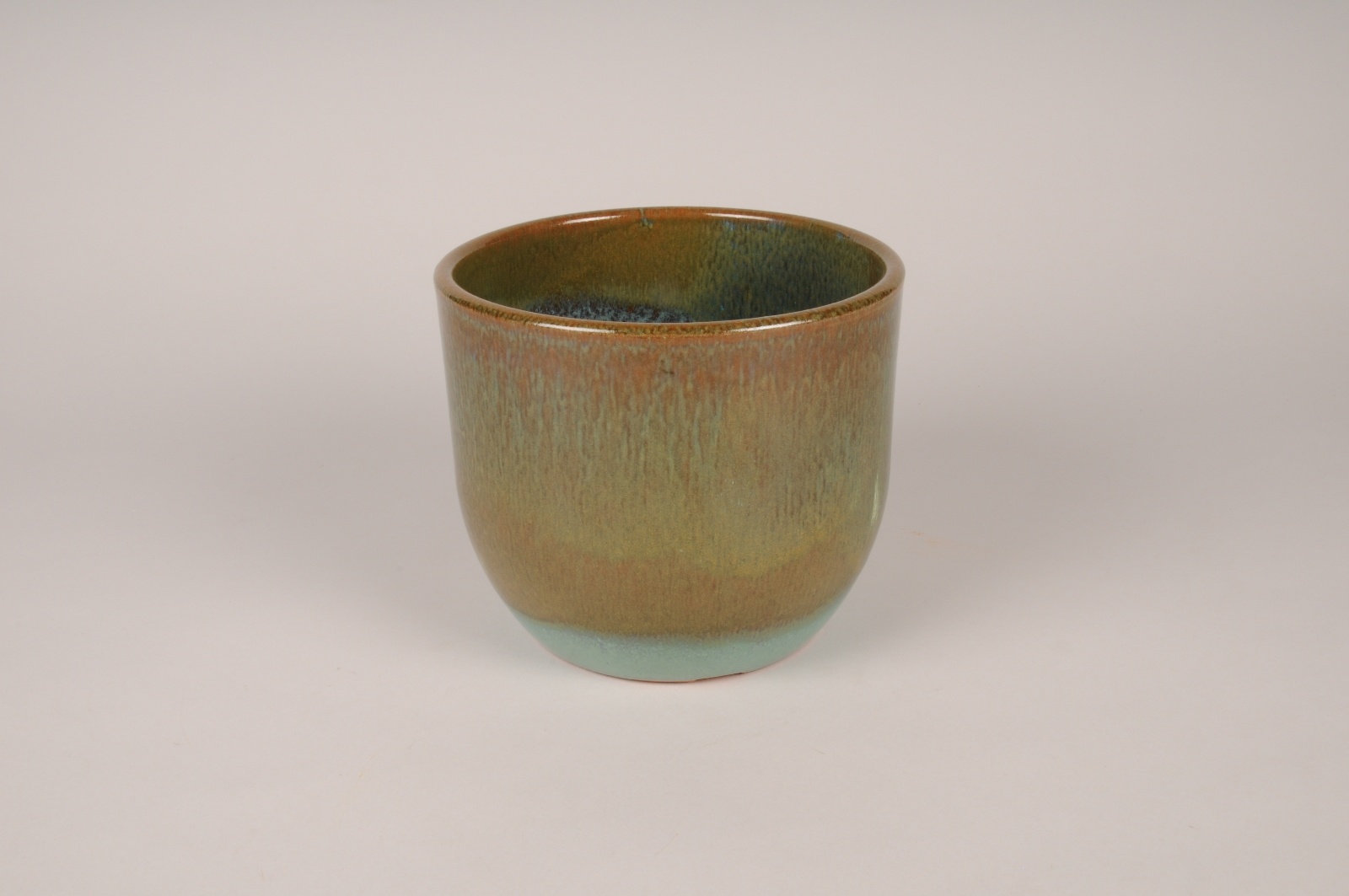 Cache-pot en céramique émaillée bleu paon dans les nuances de bleu pétrole, de vert canard et de bronze diamètre 19cm hauteur 16cm