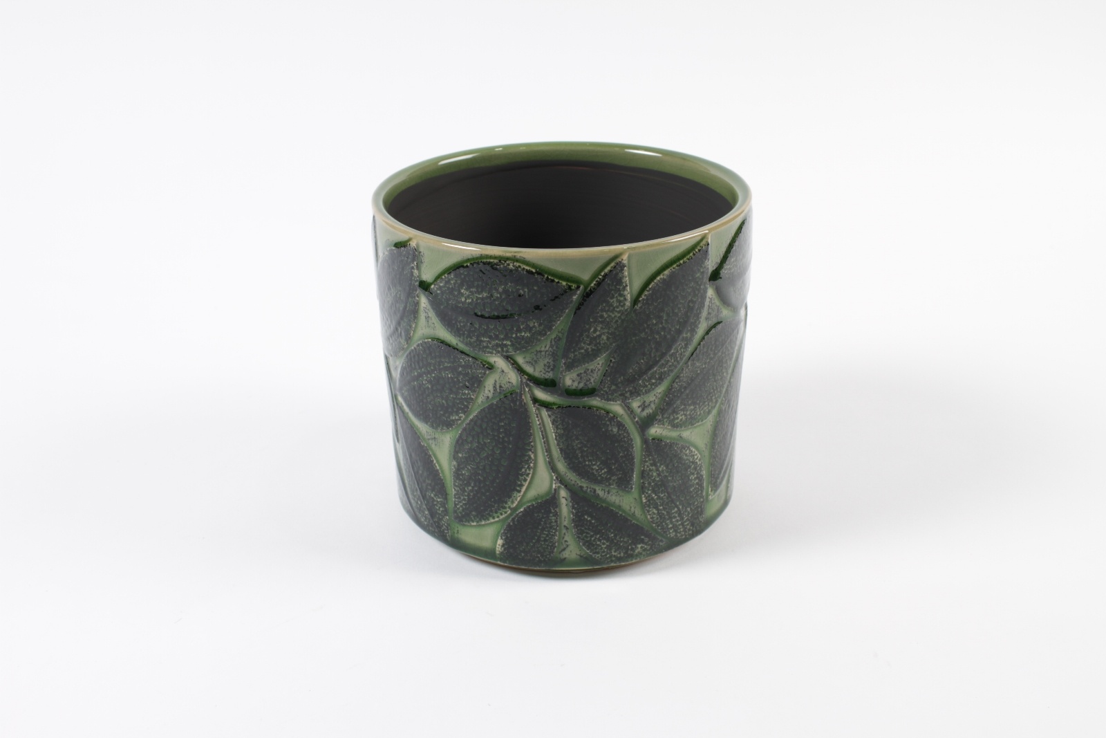 Cache-pot en céramique émaillée motif feuille verte diamètre 14cm hauteur 12.5cm