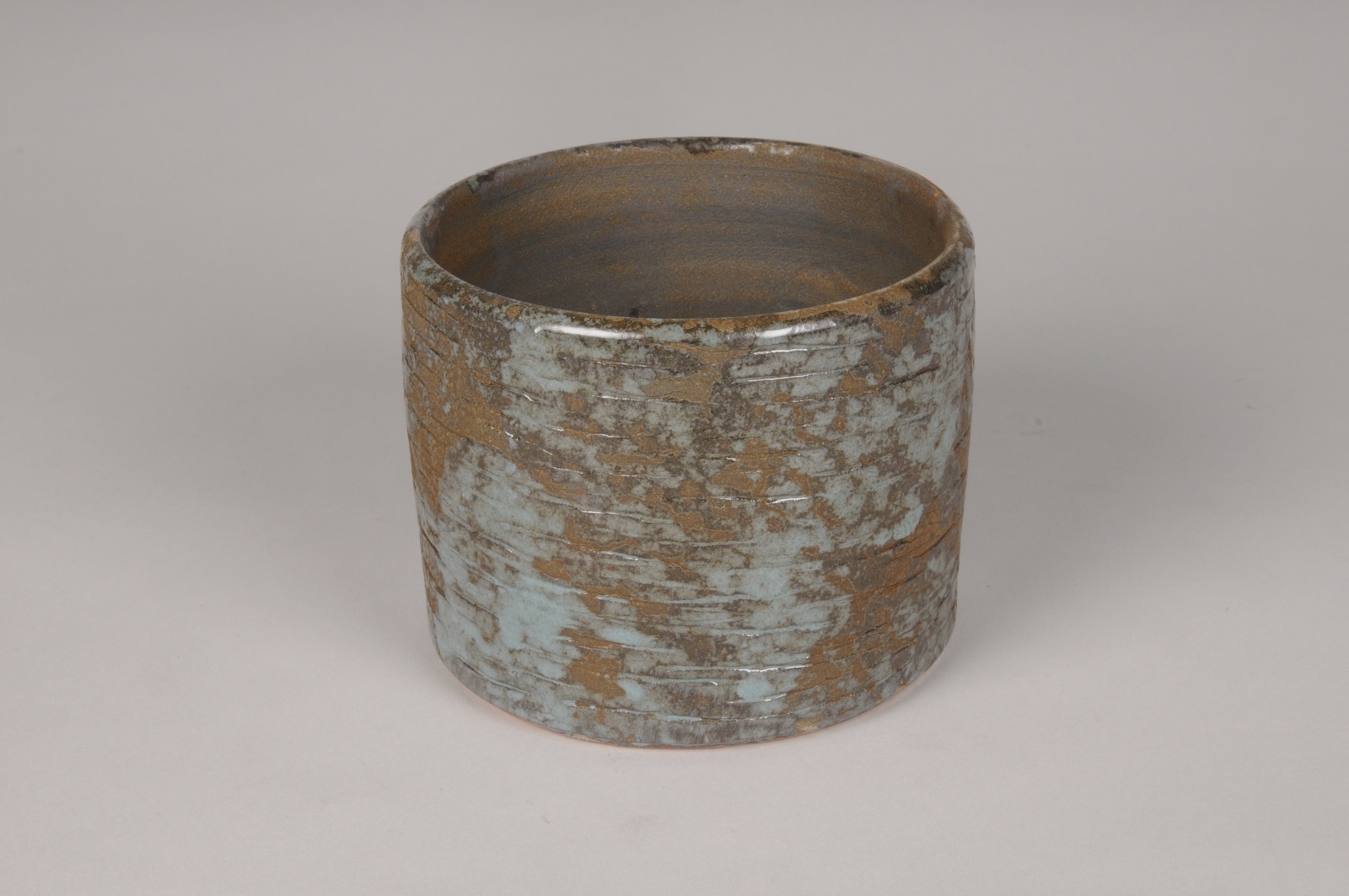 Cache-pot cylindrique en céramique gris bleu vieilli émaillé et brut diamètre 13.5cm hauteur 12.5cm