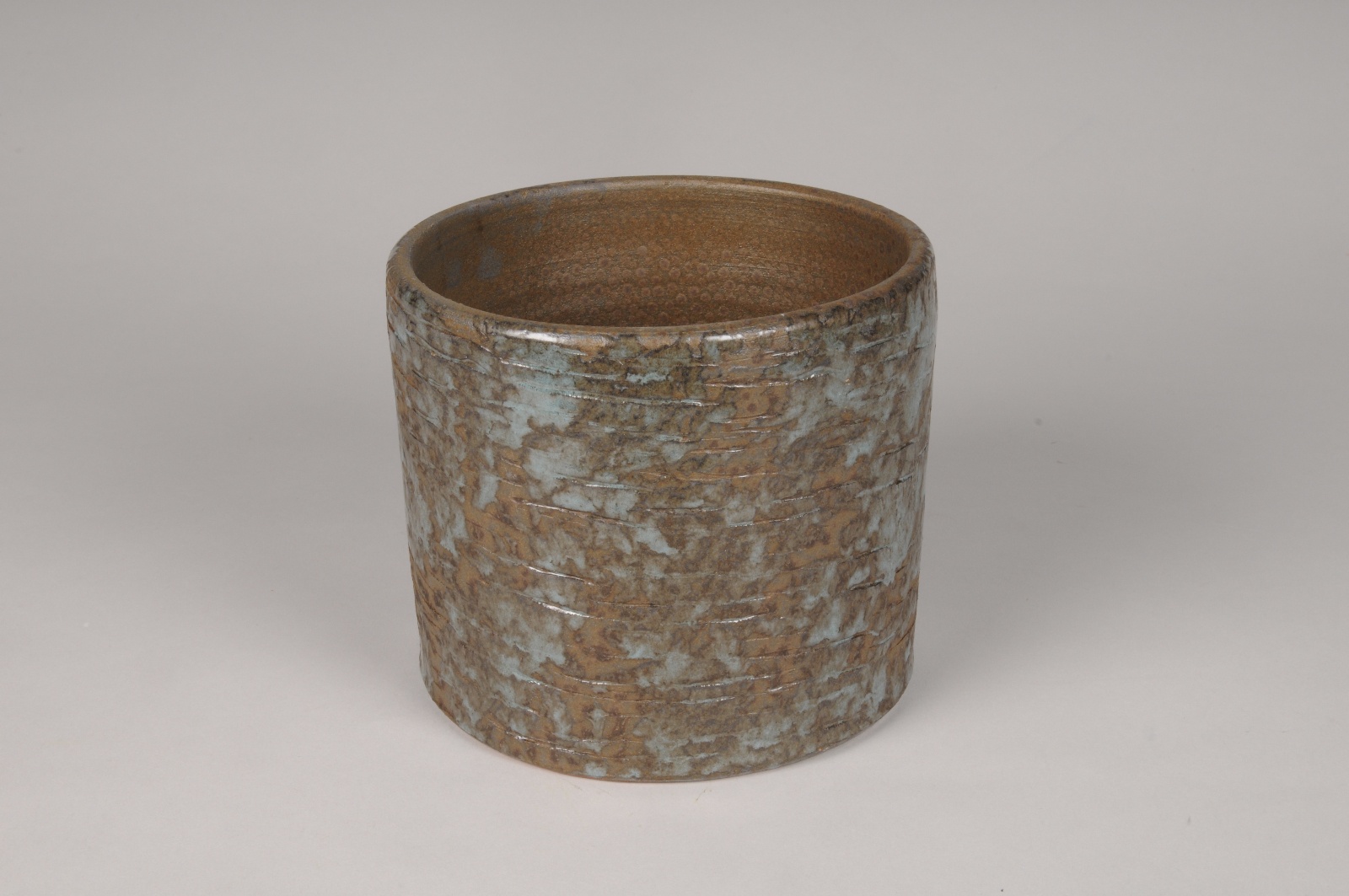 Cache-pot cylindrique en céramique gris bleu vieilli émaillé et brut diamètre 18.5cm hauteur 16cm