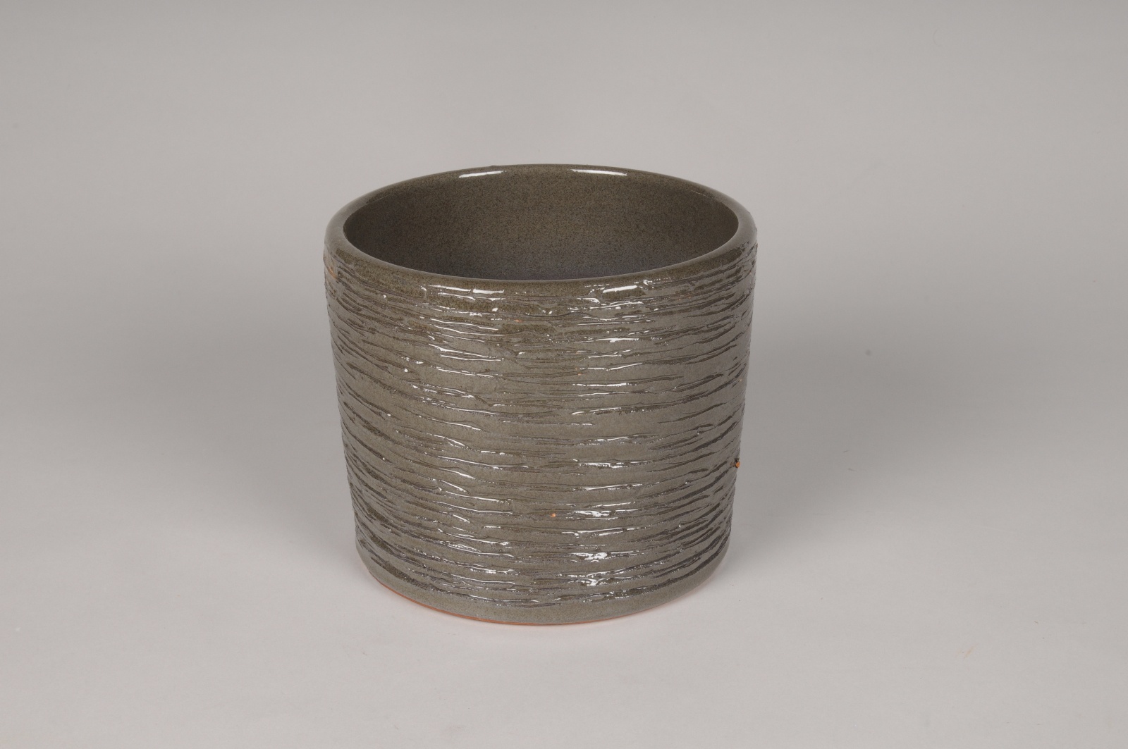 Cache-pot cylindrique en céramique marron foncé kaki irisé d'aspect brillant diamètre 18.5cm hauteur 16.5cm