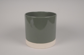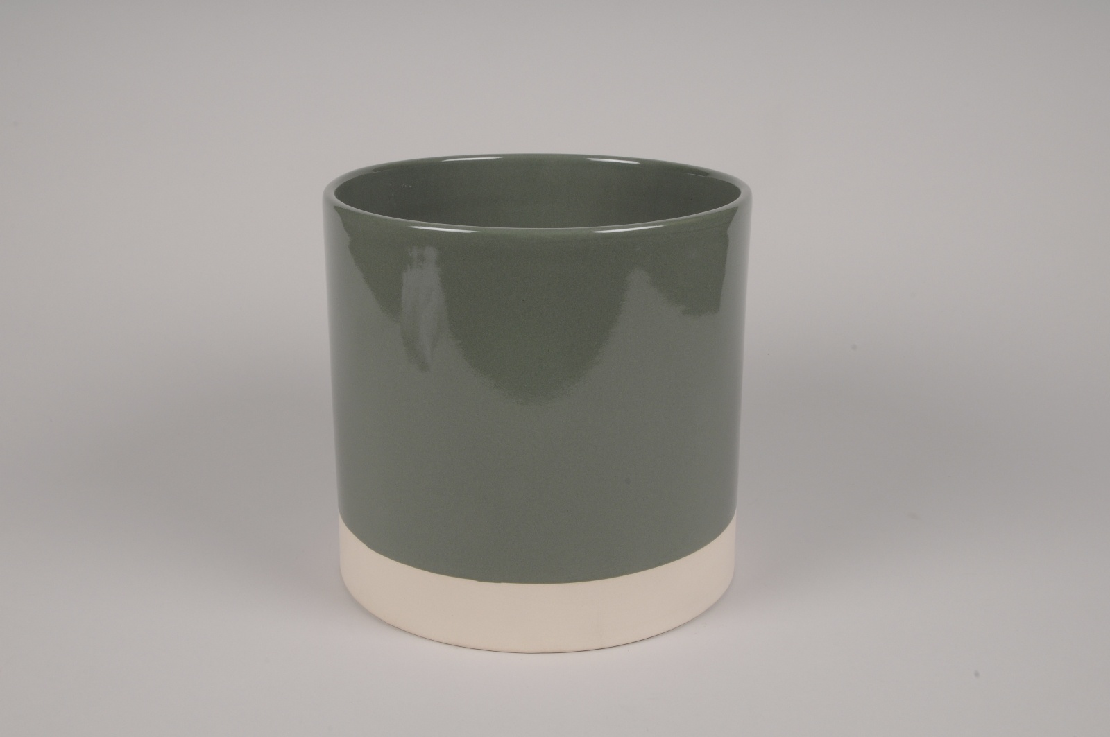 Cache-pot cylindrique en céramique vert kaki base non émaillée blanche diamètre 21cm hauteur 19cm