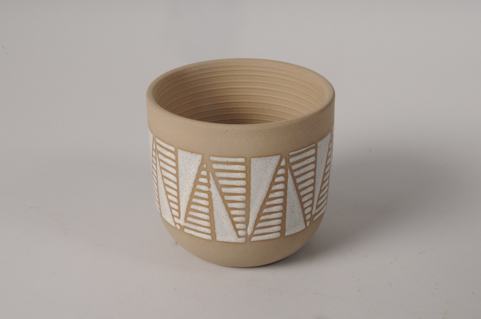 Cache-pot en céramique beige avec motifs géométriques ethniques blancs diamètre 14.5cm hauteur 13cm