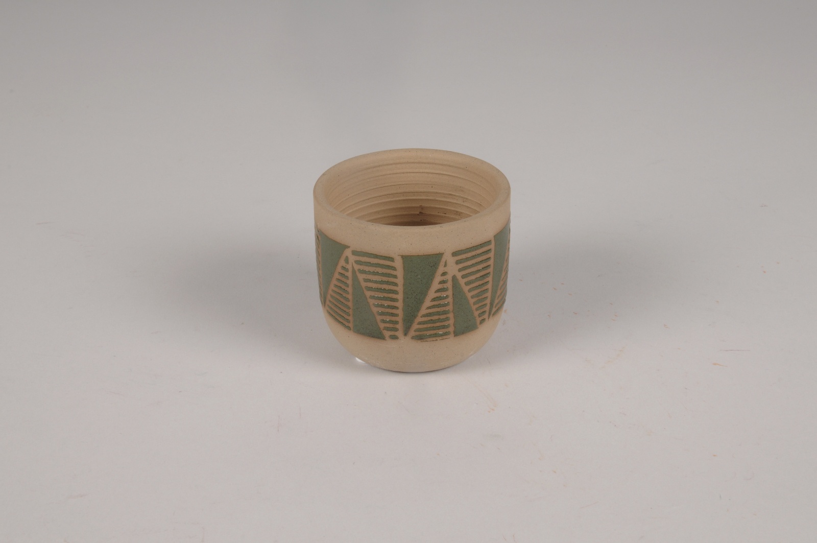 Cache-pot en céramique beige avec motifs géométriques ethniques verts diamètre 7.5cm hauteur 6.5cm