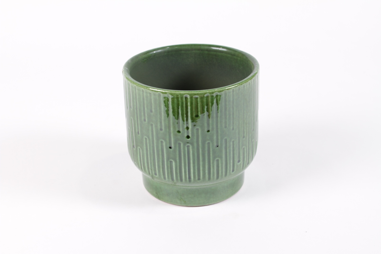 Cache-pot en céramique vert brillant avec un motif de rayures verticales diamètre 17cm hauteur 15cm