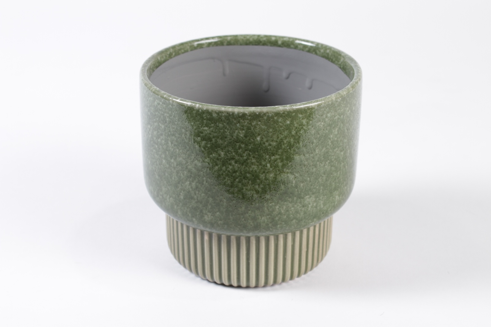 Cache-pot en céramique vert olive avec base striée vert clair diamètre 19.5cm hauteur 17.5cm