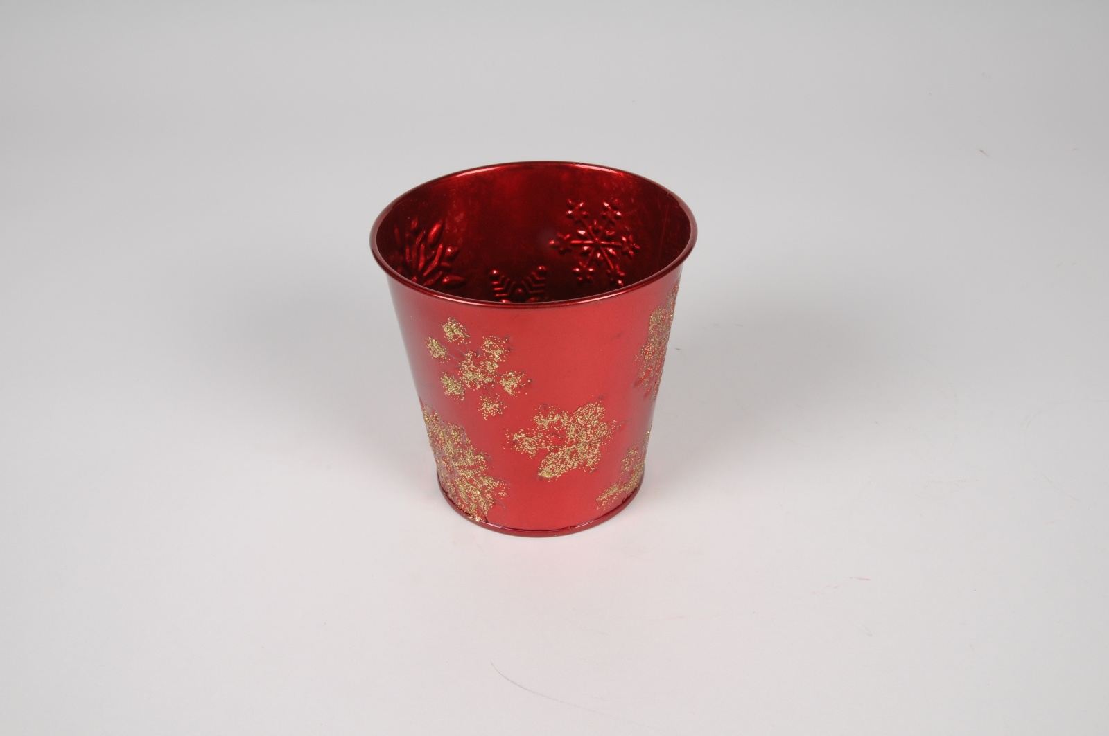 Cache-pot en zinc rouge avec motifs de flocons pailletés or diamètre 11cm hauteur 10.5cm