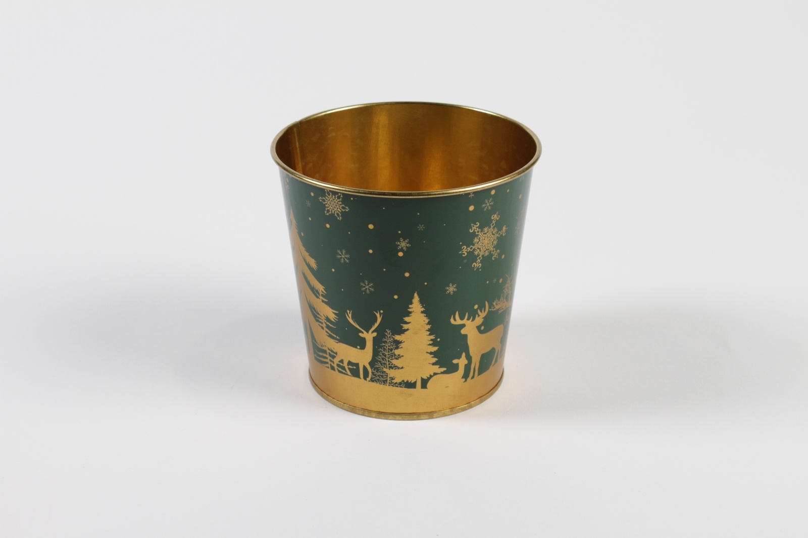 Cache-pot en zinc vert or Noël D11.4cm H10.6cm