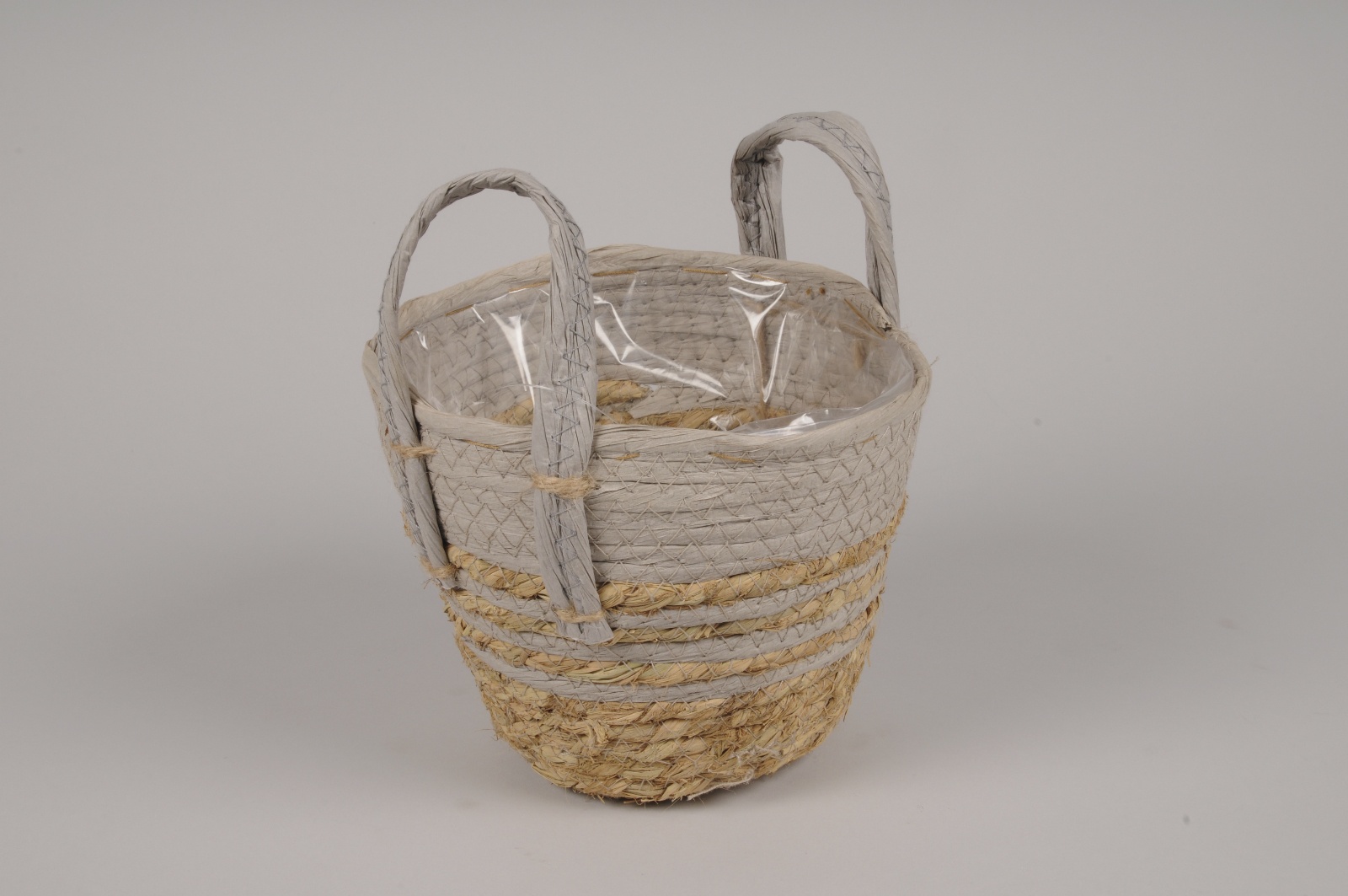 Cache-pot panier en jonc gris et naturel D18cm H16cm