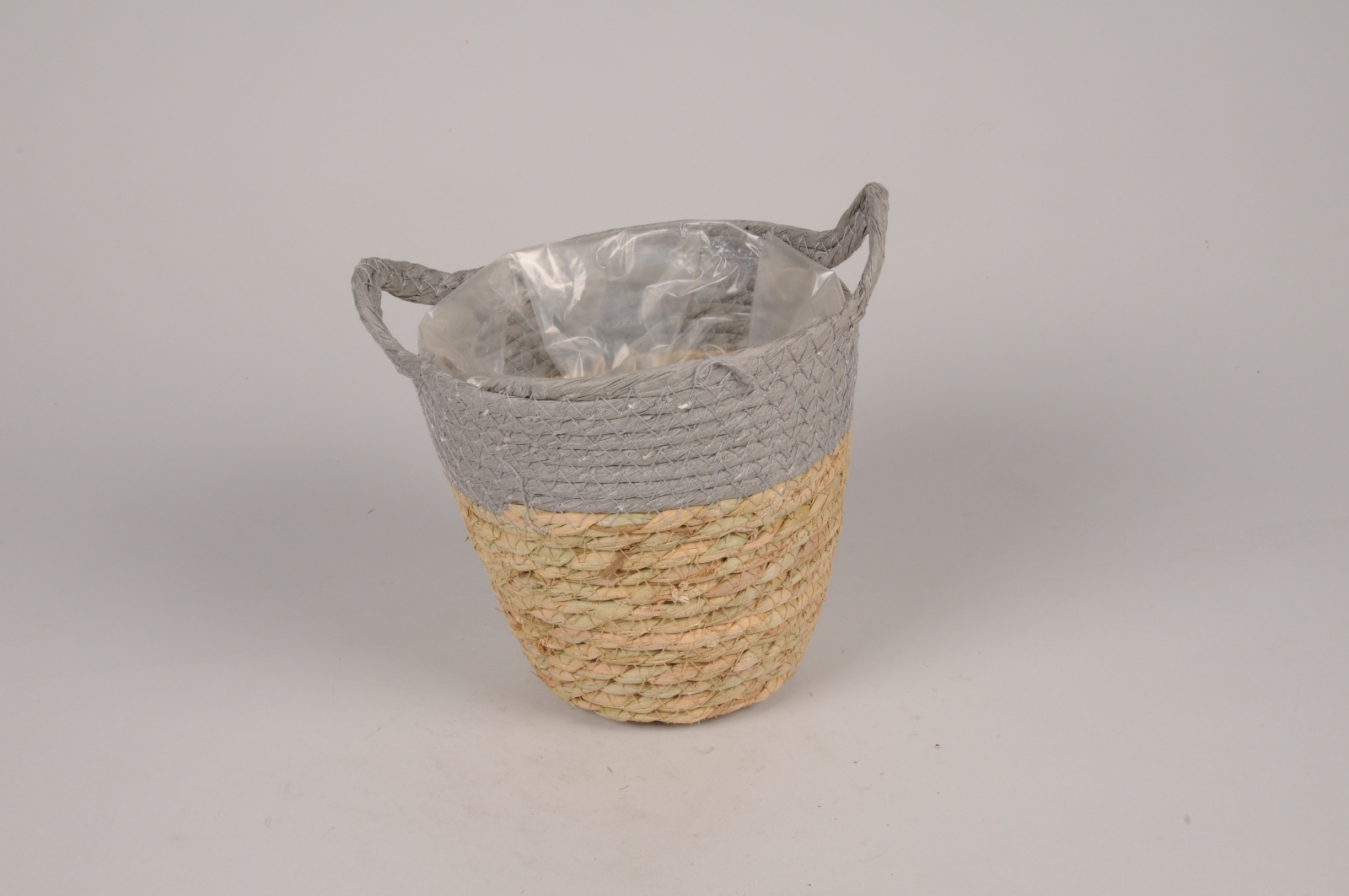 Cache-pot panier en jonc naturel et gris D16cm H16cm