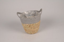 Cache-pot panier en jonc de mer naturel et gris diamètre 16cm hauteur 16cm