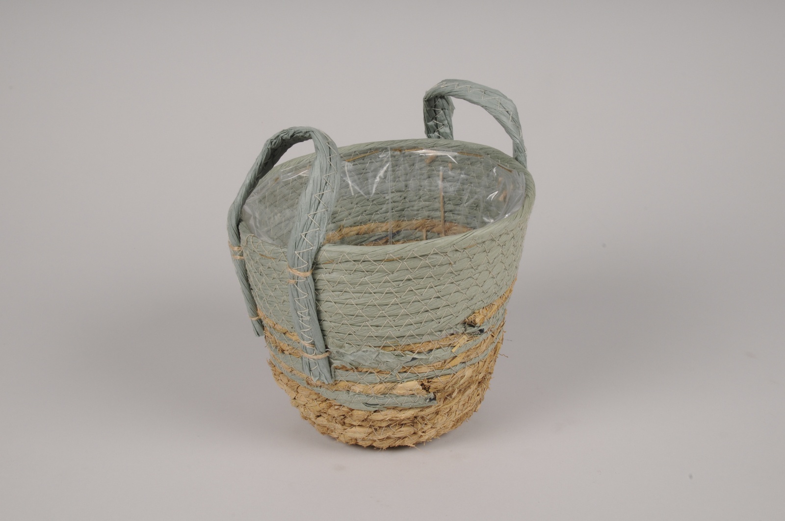 Accueil > Contenants > Vannerie > Paniers > Cache-pot panier en jonc vert et naturel D18cm H16cm