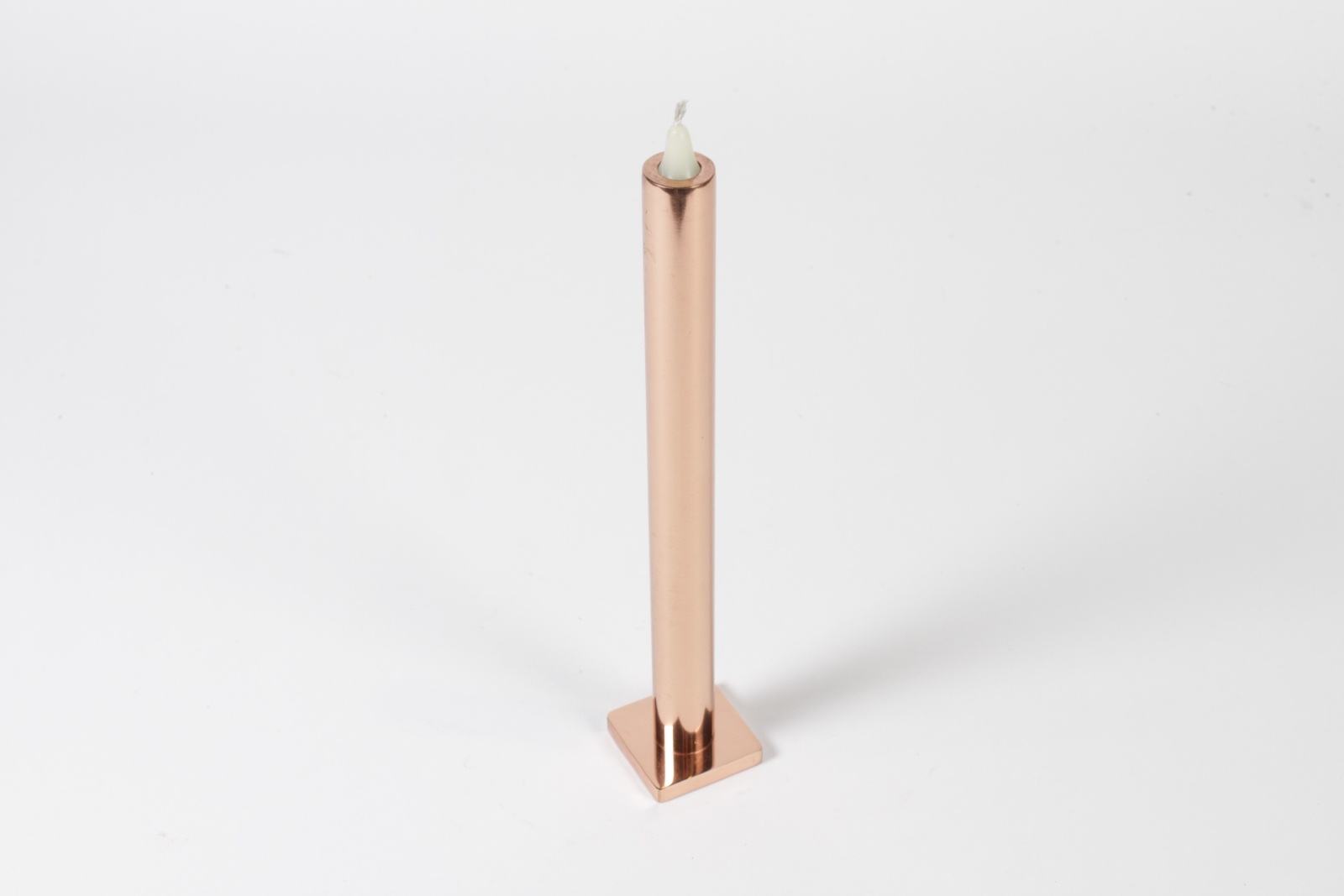 Table candlestick with spring that uncoils gradually to always keep the candle at candlestick level, even though the taper dwindles. Candlestick: stainless steel with a copper metallic color. Candle: mineral wax enriched with vegetal wax. Lead-free cotton wick. Burns for approximately 8 hours. Size: H28cm / L (basis): 5 cm