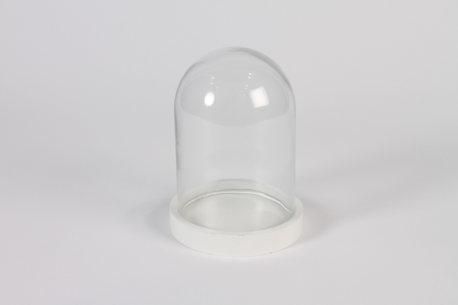 Cloche en verre avec plateau en bois blanc diamètre 11.5cm hauteur 16cm