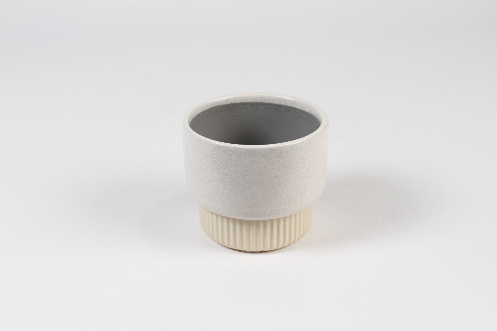 Cream and white ceramic planter with cream striated base diameter 11cm height 9.5cmInside diameter 9.5cmBase diameter 8.5cm