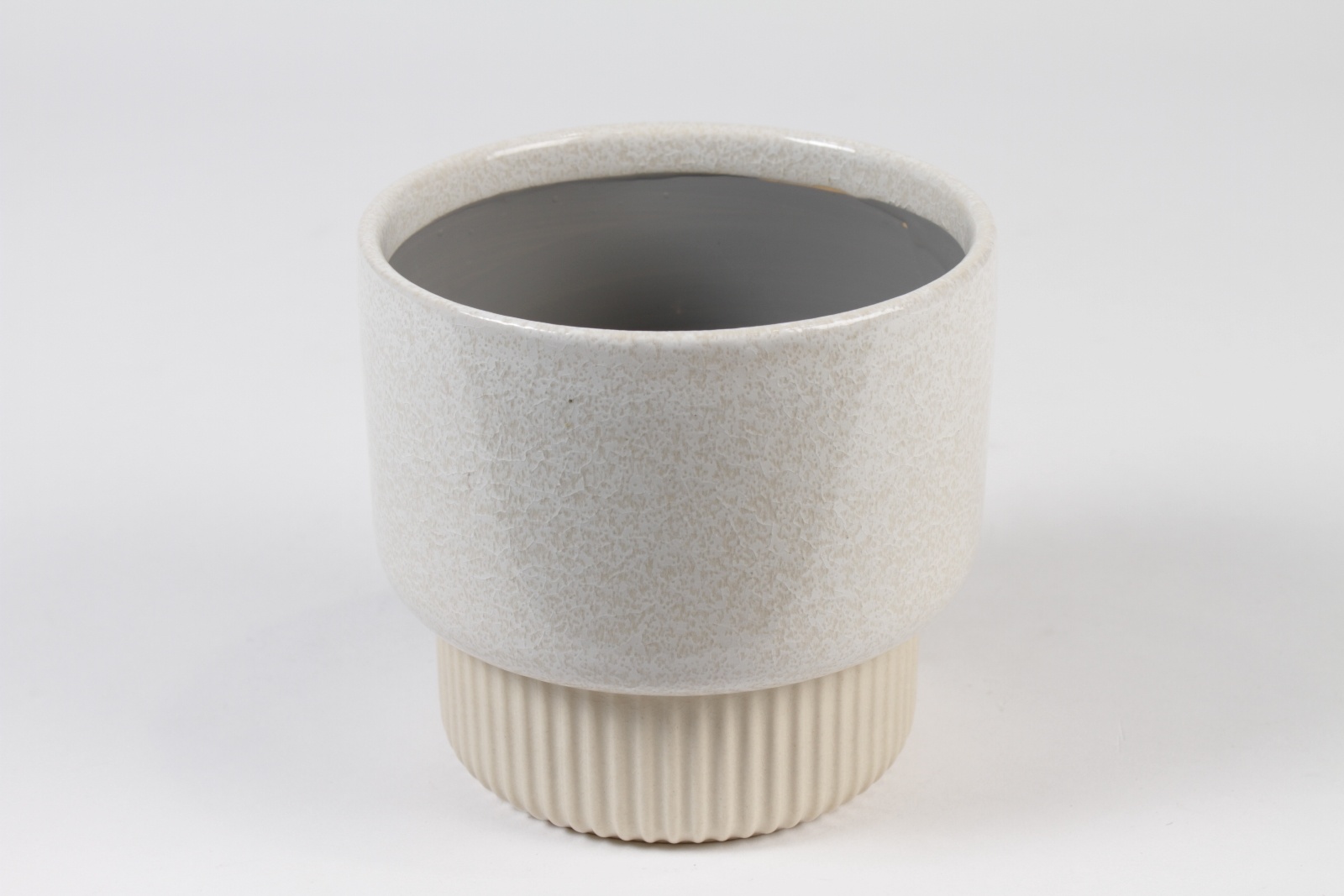 Cream and white ceramic planter with cream striated base diameter 19.5cm height 17.5cmInside diameter 17.5cmBase diameter 15cm