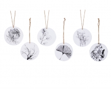 White glass flat ball hanging with black leaves and branches patterns assorted diameter 8cm 6 different patterns