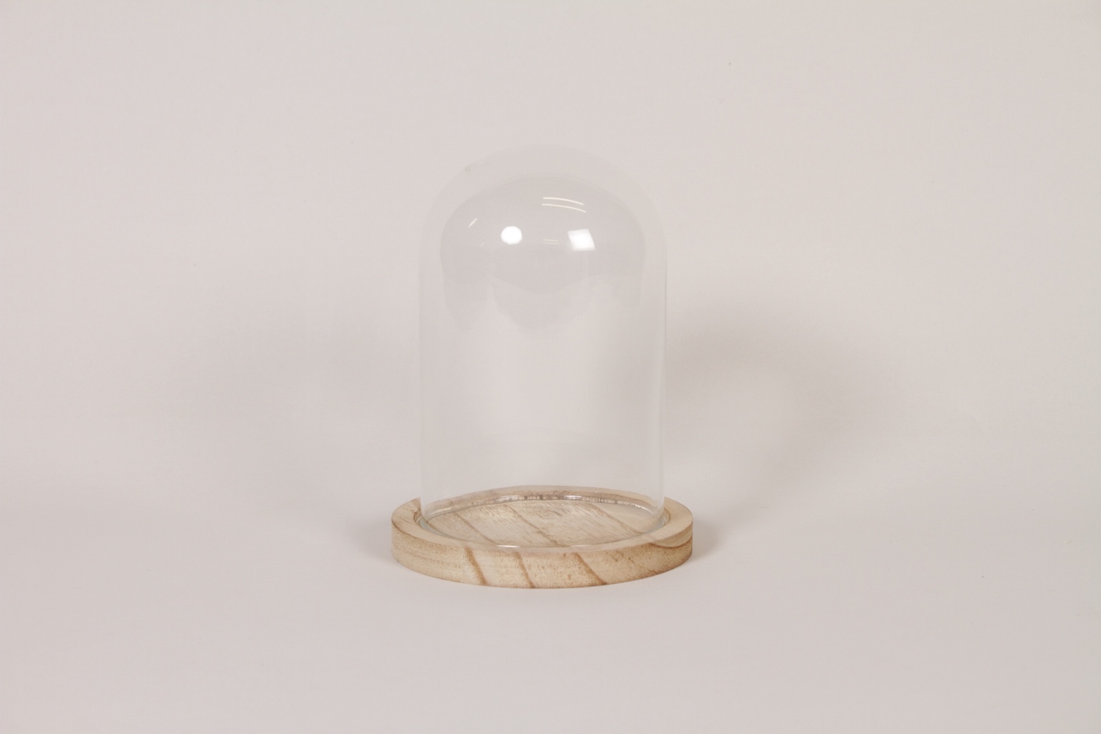 Glass dome or bell jar and wooden tray diameter 12cm height 16cm