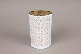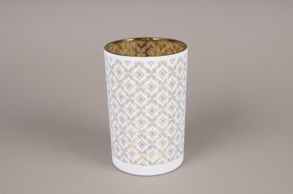 Ref. : P5-000012 Gold and white diamond motif glass light holder diameter 12cm height 18cm