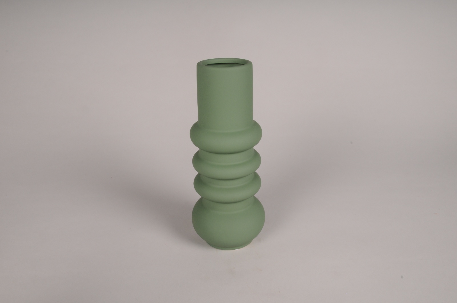 Green matt design ceramic vase with rounded shapes and smooth surface Diameter 10cm height 24.5cmOpening diameter 5cmBase diameter 7cm