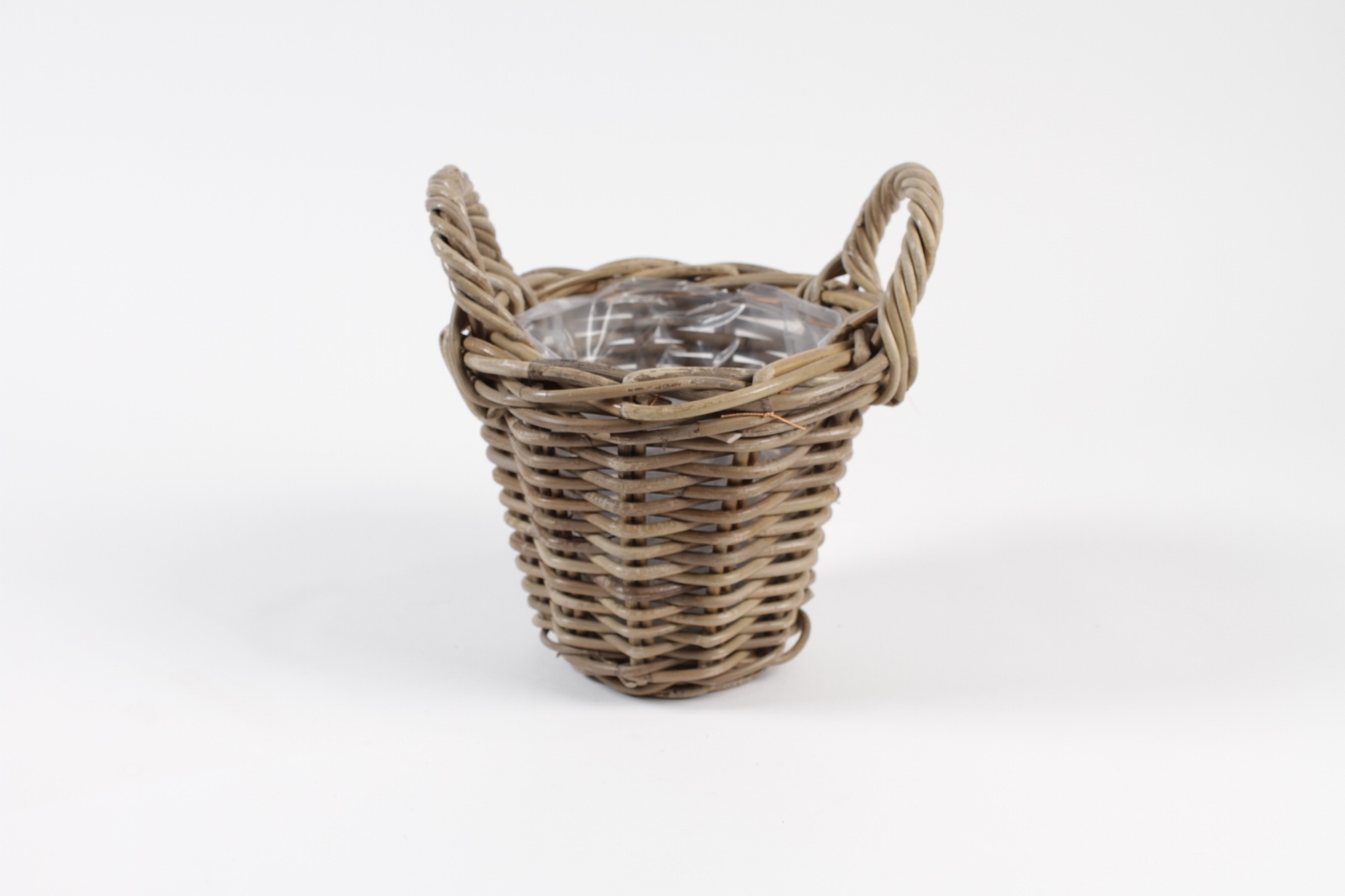 Grey kubu rattan basket planter with handles diameter 15cm height 12cmBase diameter 8cmPlastic film inside