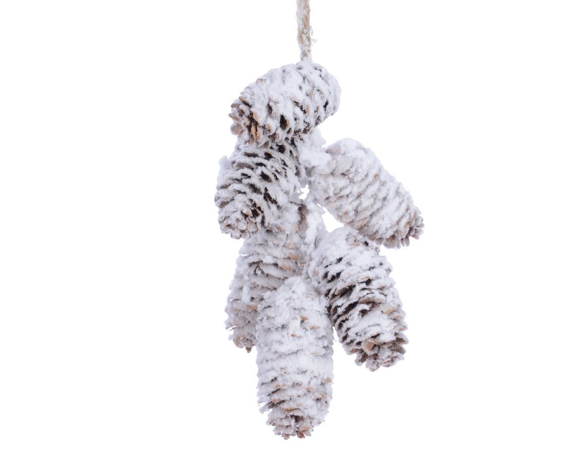 Hanging snow covered 6 pine cone on jute rope width 11cm height 18cm