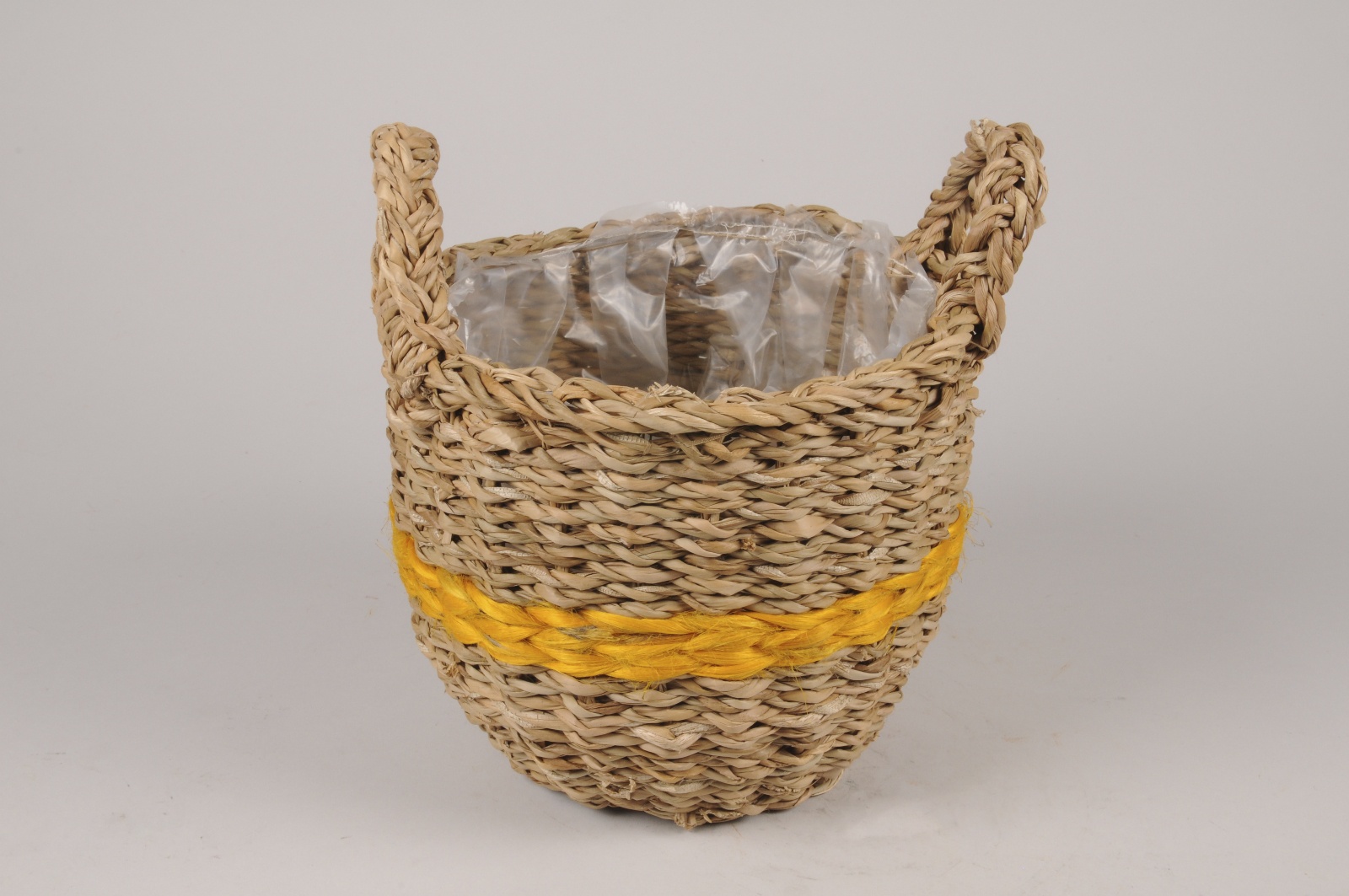 Natural and yellow seagrass planter basket with handles diameter 21cm height 18cmInside diameter 18.5cmBase diameter 13.5cmPlastic film inside