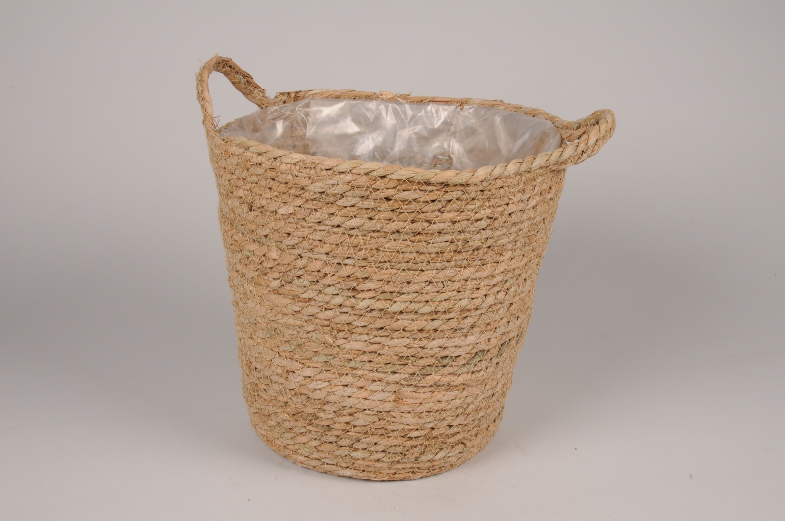 Natural seagrass planter basket diameter 27cm height 26cmInside diameter 26cmBase diameter 21cmHeight with handles 31cmPlastic film inside