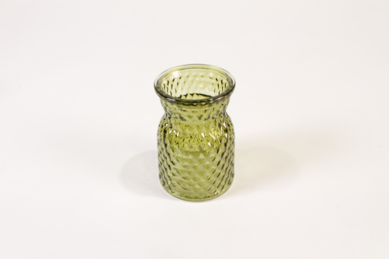 Olive green glass vase with diamond pattern diameter 7.5cm height 10.5cmOpening diameter 6cm