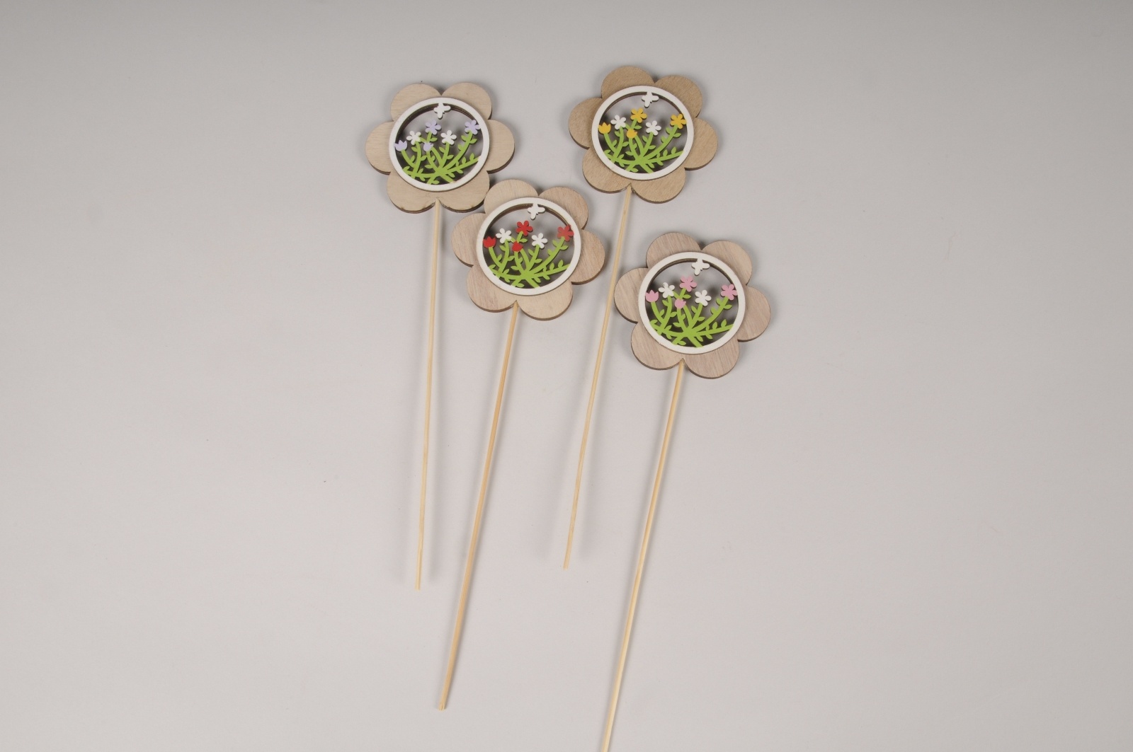 Pack of 12 assorted pink, red, purple and yellow wooden flowers picks Height 27cmFlowers diameter 8cm