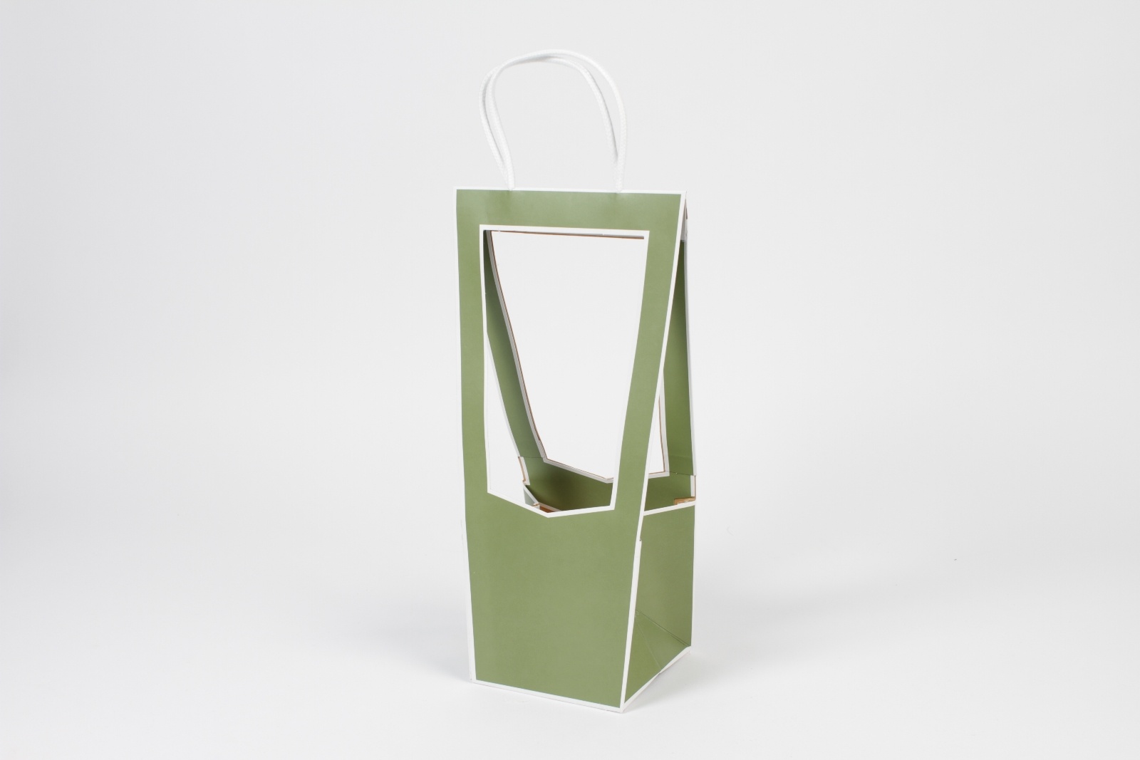 Paquet de 5 sacs ou porte-bouquet en carton vert kaki et blanc avec fenêtres et poignées largeur 18cm hauteur 35cm