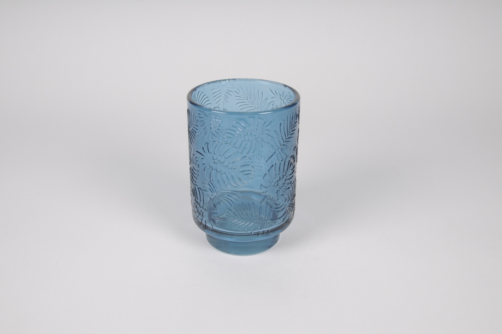 Photophore en verre sur pied bleu avec motif feuille diamètre 10cm hauteur 15cm