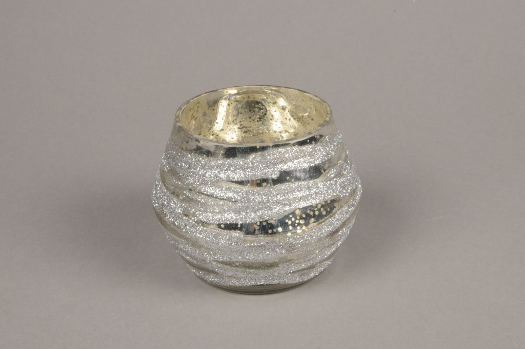 Réf. : LE-000039 Photophore en verre boule argent vieilli et paillette diamètre 9cm hauteur 8cm