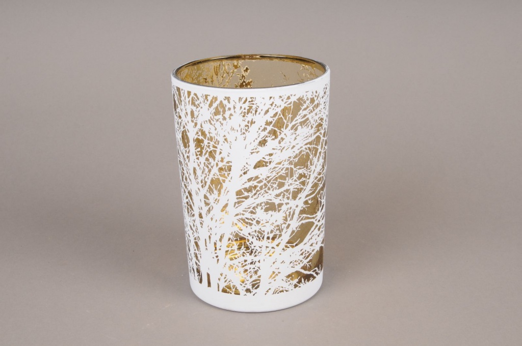 Réf. : P5-000015 Photophore en verre or avec motif branches blanches diamètre 12cm hauteur 18cm