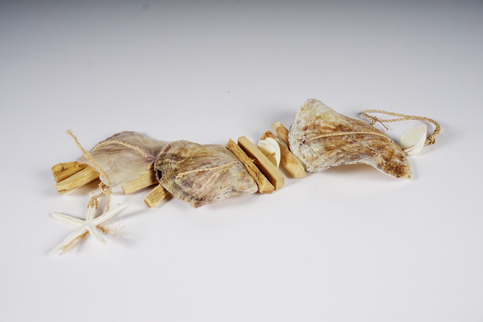 Placuna shells, driftwood and shells garland lenght 66cmWidth of the wood pieces about 8cm