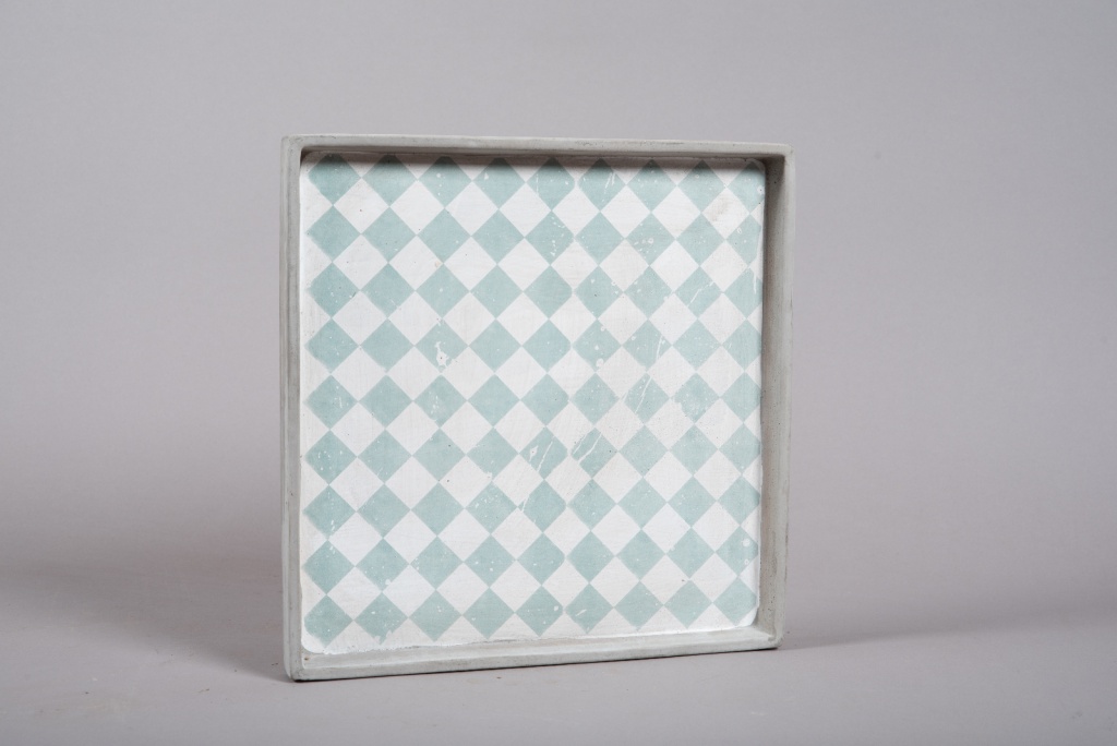 Plateau en béton blanc avec motif losanges bleu largeur 32cm longueur 32cm rebord 3cm