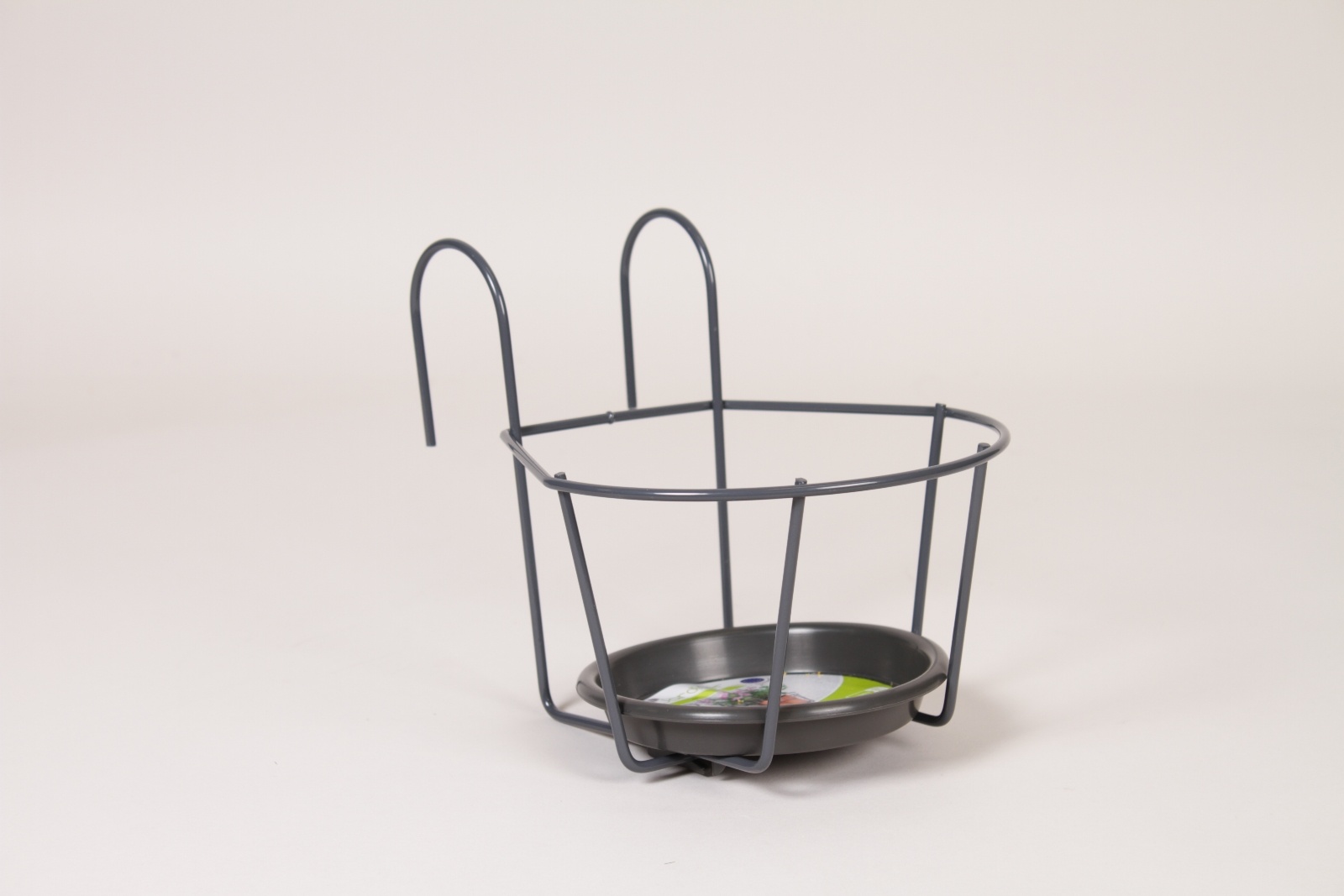 Porte pot balcon en métal gris avec une soucoupe diamètre 16cm hauteur 18cm